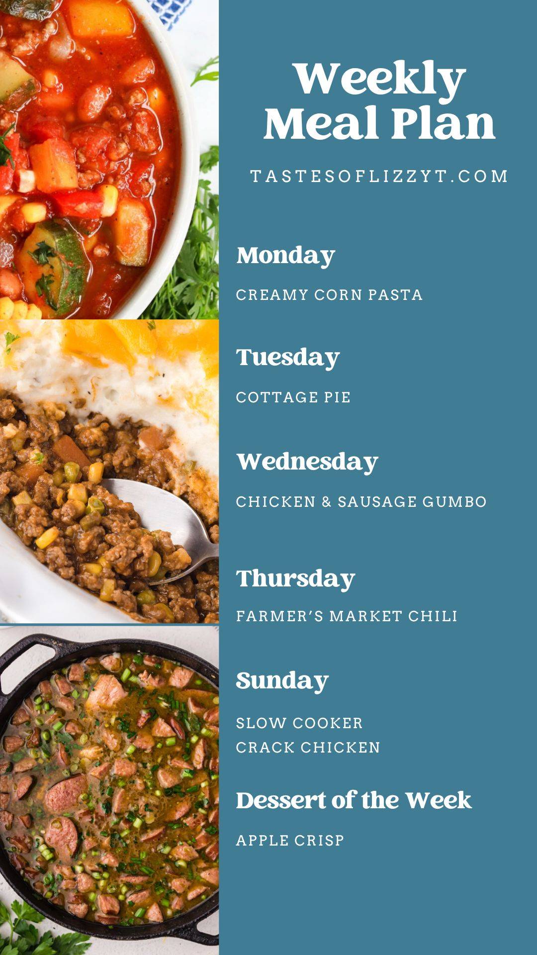 Meal Plan for September 11-17 Monday: Creamy Corn Pasta. This has been a favorite this fall with fresh summer corn. Use a quality frozen corn if you don't have fresh. Keep it meatless, or add chicken. Tuesday: Cottage Pie. Uses ground beef and freezer veggies. Wednesday: Chicken & Sausage Gumbo. Step by step instructions for a classic southern dish. Thursday: Farmer's Market Chili. Use up those garden veggies! This uses ground turkey so is a healthy option for the week. Sunday: Slow Cooker...