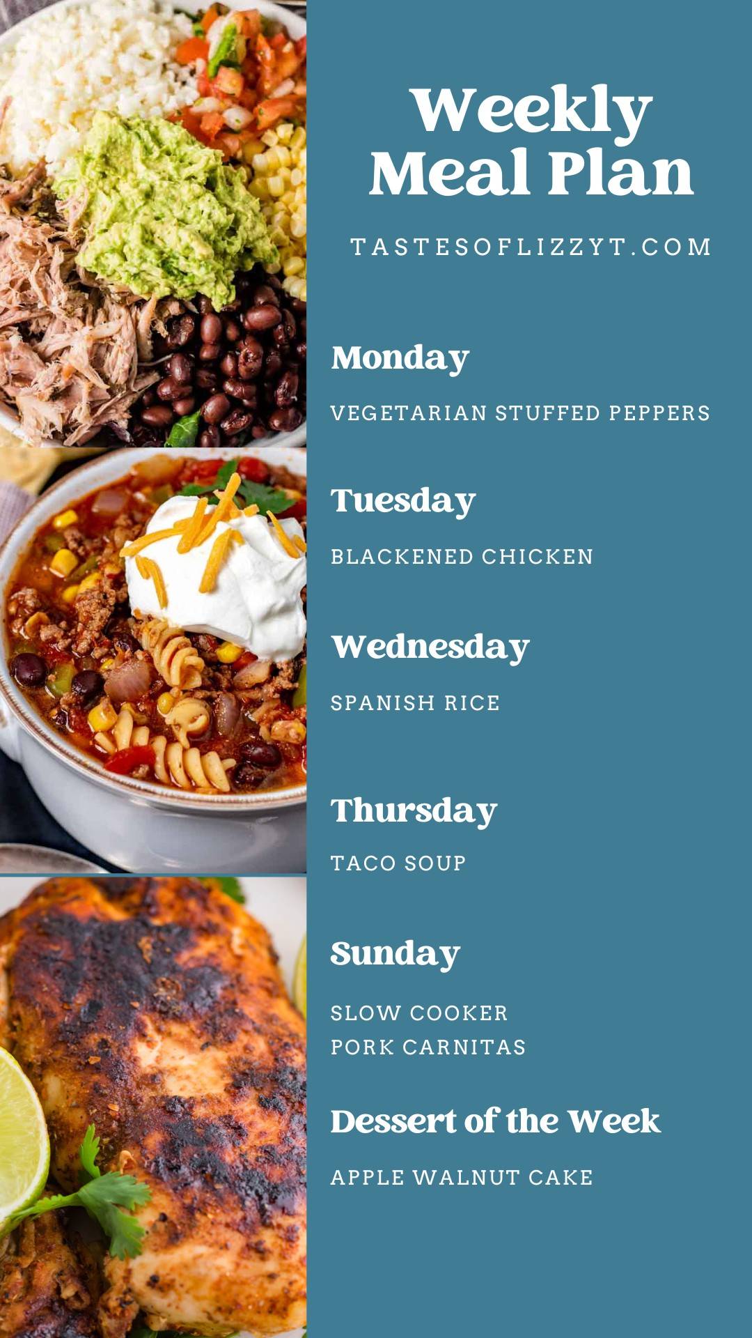 It's mid September and nights are getting cool. I love this time of year. Ohio has beautiful weather and stunning sunsets. And cooler weather means I feel like being in the kitchen more!The meal plan this week has a vegetarian option, quick dinners and even a soup. If you love apple desserts, this apple walnut cake is for you. It's easy and is delicious served warm with ice cream. 🤤 Monday: Vegetarian Stuffed Peppers Tuesday: Blackened Chicken Wednesday: Spanish Rice Thursday: Taco Soup...